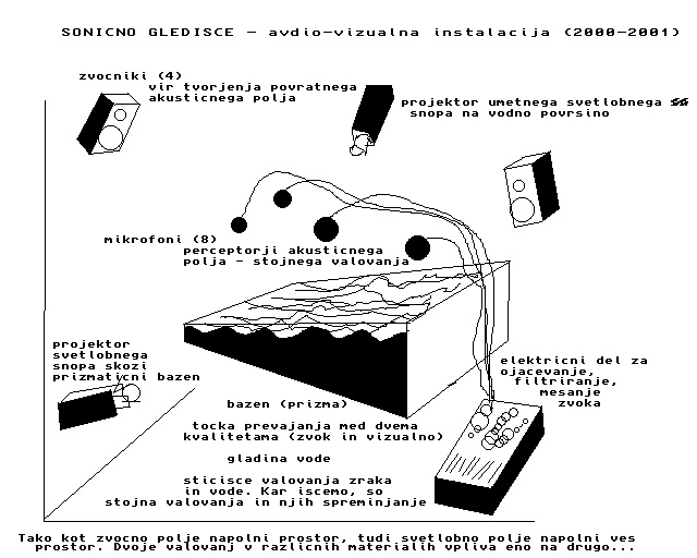 Izvedba: Sestavili smo dva modula: okroglo mizo (scratch'o'phone!?), ki je nevsakdanji zvočni vmesnik (interface) "s katerim je vsakdo lahko virtuoz" (->ker nihče ne more biti popoln virtuoz!). Torej: element demistifikacije, igralo (ne instrument!). S pomočjo gibanja rok nad tremi ploščami akter oblikuje zvočno podobo. Scenografijo smo zastavili minimalistično: v razmeroma velikem temačnem prostoru smo v središče postavili slabo osvetljeni podij, organiziran na način komandnega pulta (okrogla miza) in nasproti njemu točko opazovališča. "Projektor" je bil neke vrste prizma (posoda) napolnjena z vodo, na valovanje površine vode pa najk bi vplival zvočni tok v prostoru. Rezultat odseva usmerjene svetlobe na prizmo naj bi na platnu na stropu galerije risal z mavričnim odtenkom obarvane interferenčne "tkanine". Na žalost ideja ni že izvedba, predstava je eno, materialna resničnost drugo. Oblika triogle prizme (na vrhu) ni omogočala resonanc - torej tvorbe stojnih valov, čemur pa smo se pravzaprav hoteli izogniti že na začetku. Resonance so namreč del "inercije" sistema, v našem primeru pa smo hoteli trenutni odziv - neposredno risanje "po nebu". Za zadovoljivo vzbujanje obstoječega sistema bi potrebovali preveliko "ojačevanje". Jasno je, da človek s sodobnimi sredstvi lahko "ojači" karkoli, vendar se mi zdi, da je to ena od temeljnih razlik med znanostjo in umetnostjo. V umetnosti se na neki meji ustaviš, kar se tiče uporabe/zlorabe tehnoloških sredstev. Cilj ne posvečuje sredstva! Ali je to etični moment? Je.