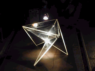 The installation hd its openning moment as a concert (it was not clear whether it was a concert, performance or something else). The gallery discourse (and the lack of a classic theatre podium) introduced its own vocabulary, but which didn't impose its own boundaries. As the "da camera" nature (the intimacy) of the installation was unappropriate for a social event, which the openning night is, I introduced the third module. I also eliminated the functionality of the second (since the "projector" didn't give any -> didn't work...). However in the view of re-mistification process I left the "projector" as a "designer's object", with its symbolic values (the pyramid) and aesthetic values (transparent, water filled and giving the light). It was a visual focus, stronger than that of the performers. As the third module Ludwig Zeininger, a sound artist from Graz/ Austria joined in. Ludwig used to play with a jazz band in Vienna (playing a computer!) and in a very interesting elektro-band Elektro Pathologic Consort. Ludwig performs with similar complex structures, but within a computer. Probably with different motives, but maybe not - we never discussed philosophy. In fact, we never discussed much of anything, and he didn't get any special instructions how to "plug in". When the focus is on "moment" the "structure" disapears...